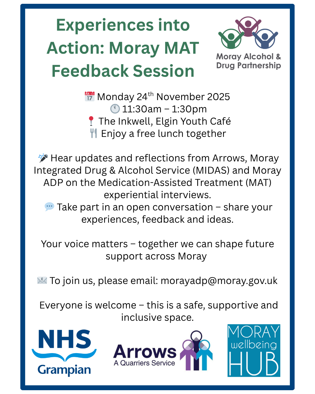 Over the past year, Arrows, Moray Integrated Drug & Alcohol Service (MIDAS) and Moray ADP have gathered lived and living experience feedback through Medication-Assisted Treatment (MAT) interviews β helping identify whatβs working well and where improvements are needed.